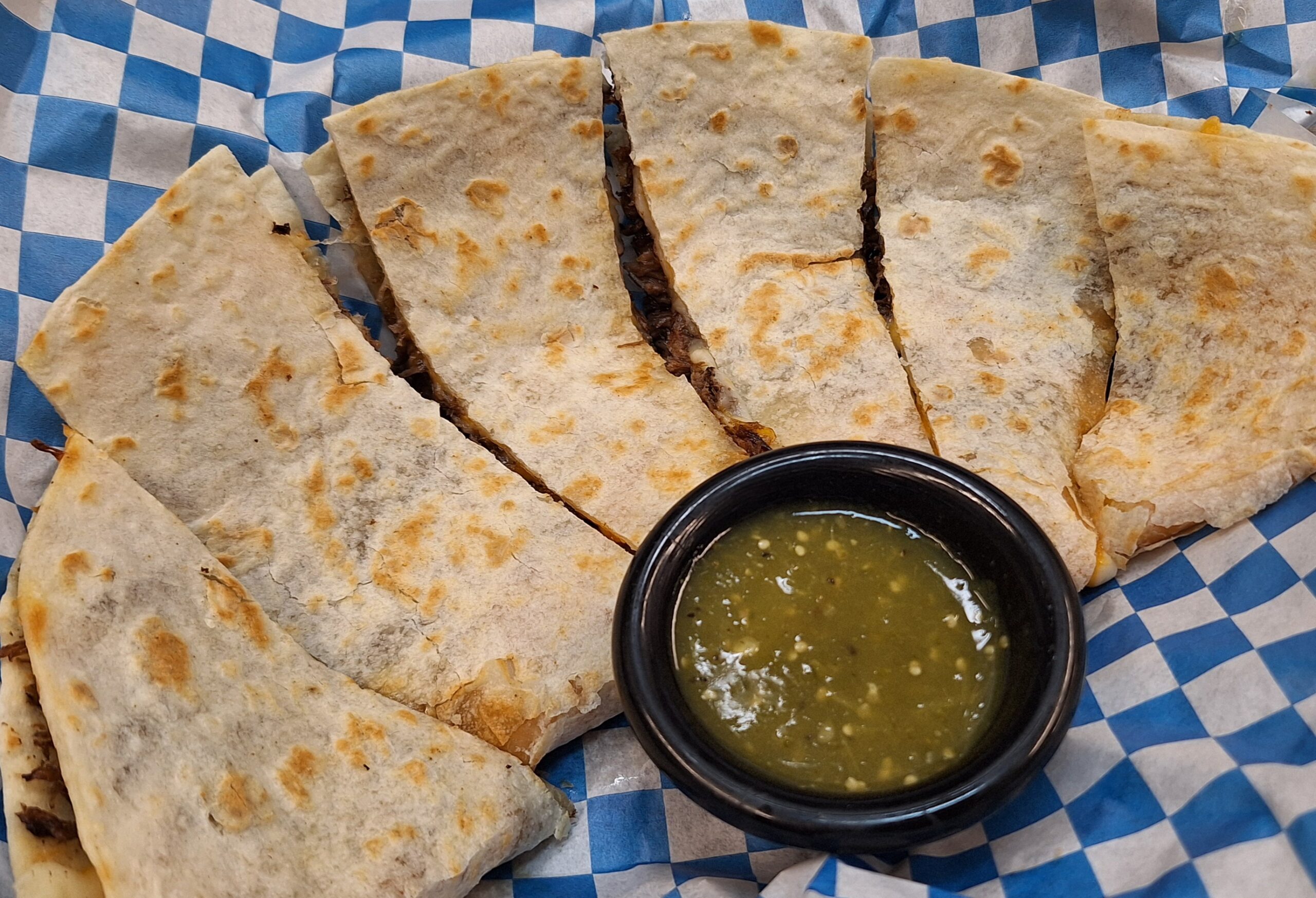Mary’s Shredded Beef Quesadilla! Slow cooked beef marinated in a spicy family recipe, mozzarella cheese on warm flour tortilla with a side of homemade spicy tomatillo salsa.