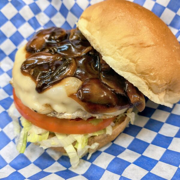 Our Delicious Holiday Burger! We start with a juicy turkey patty topped with melted swiss cheese, homemade rosemary demi-glace, mushrooms, lettuce and tomato all in a warm bun.
